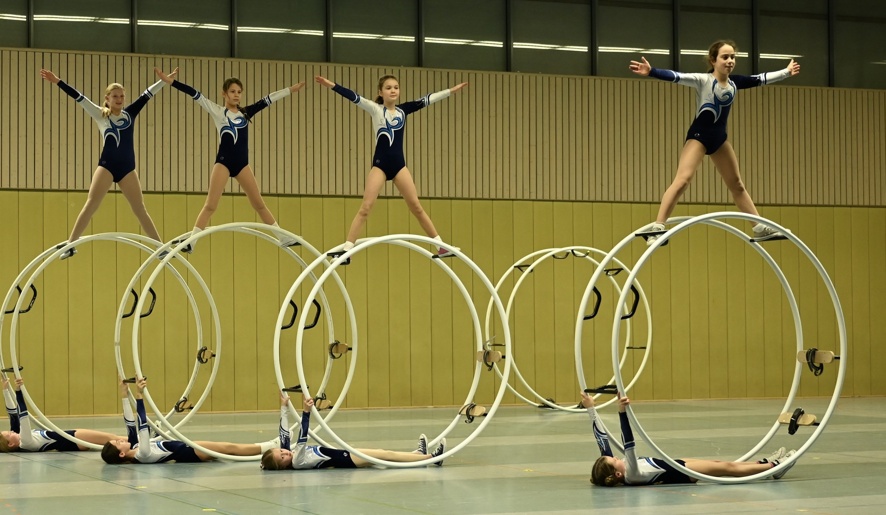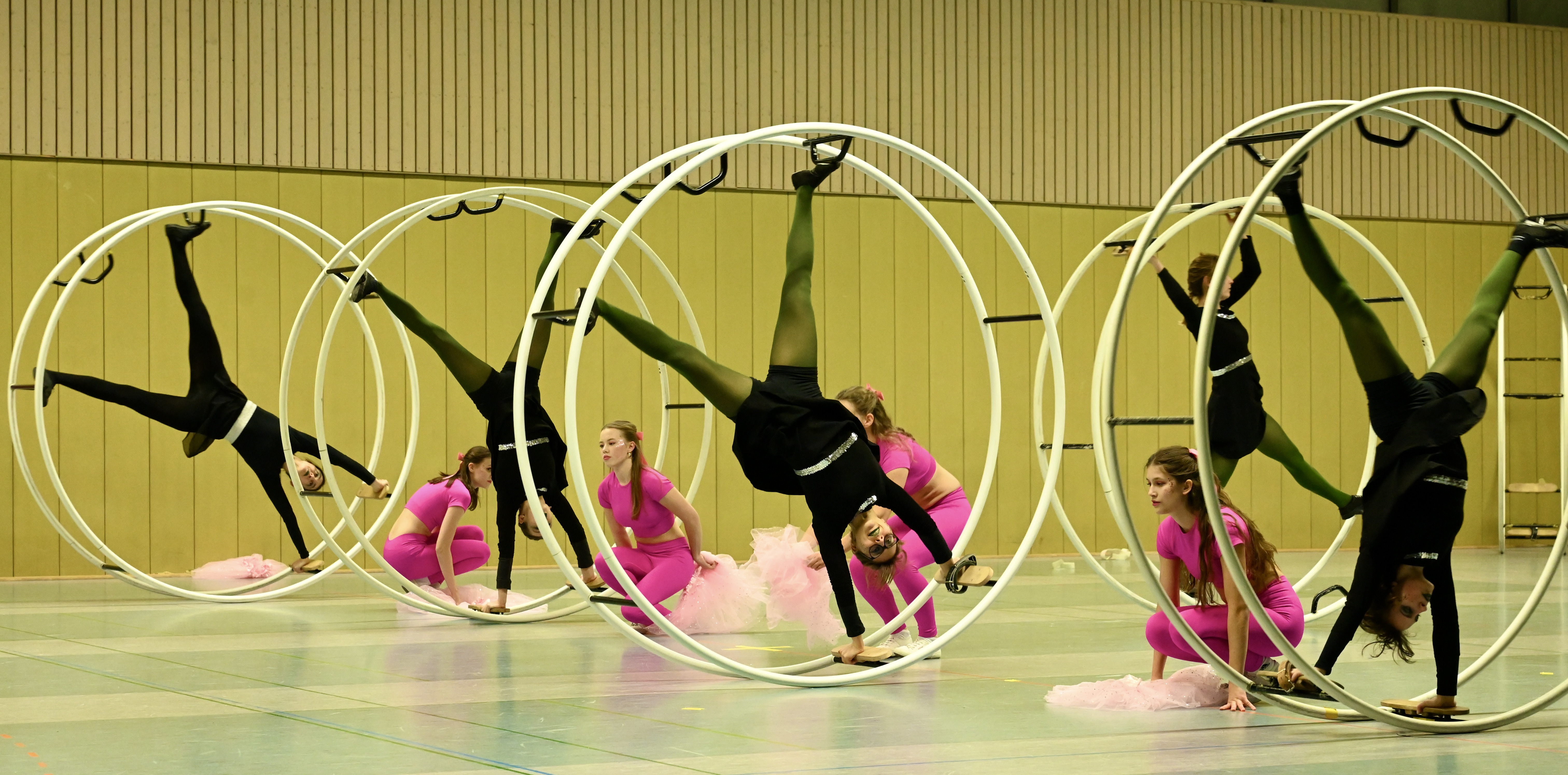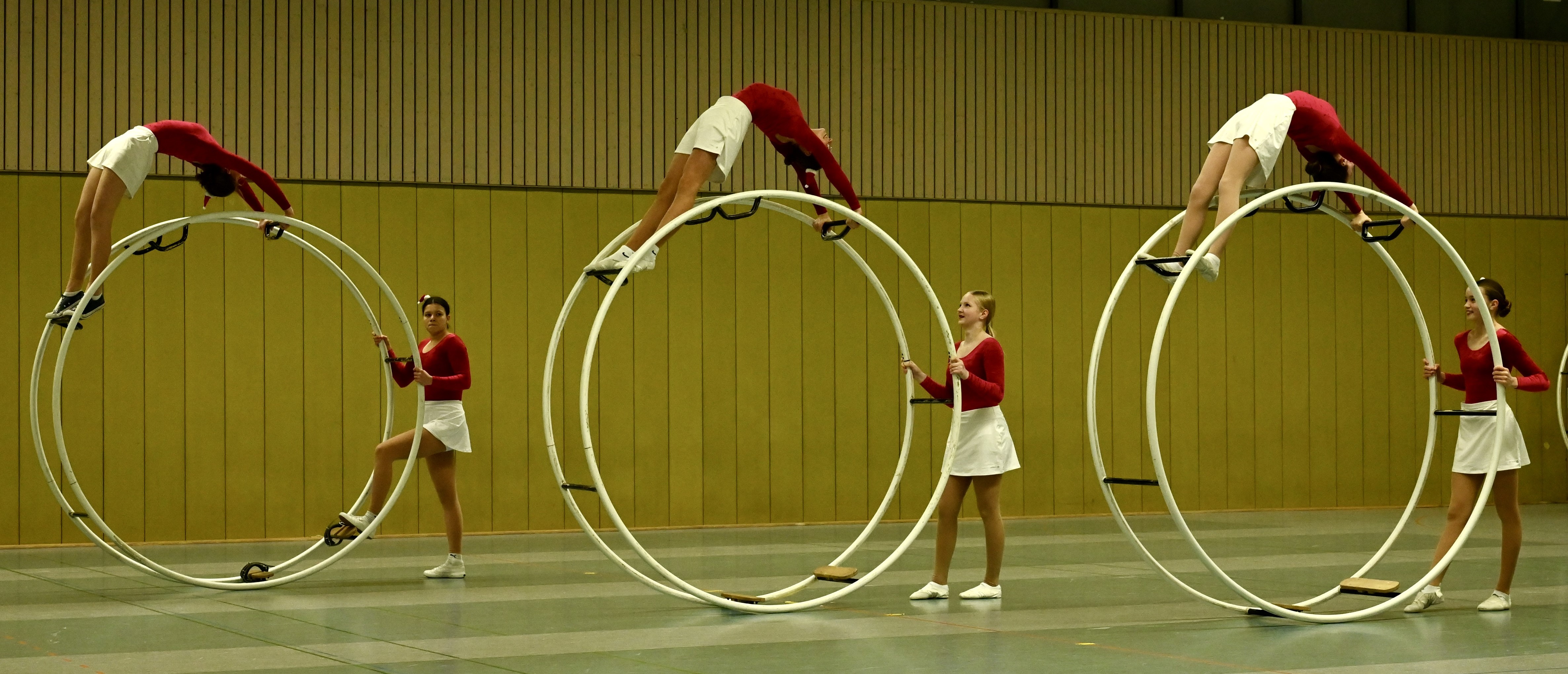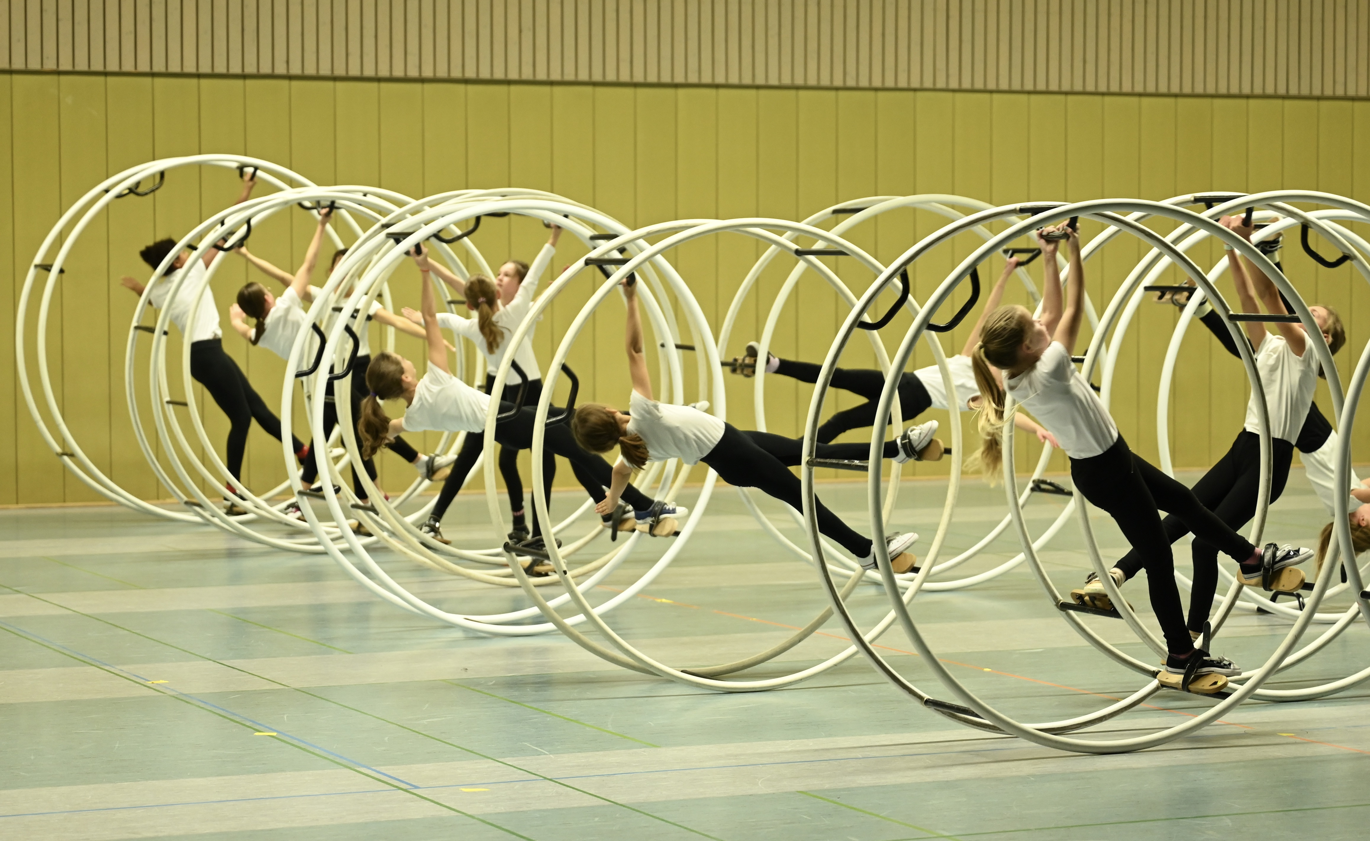 Und dann ging es auch gleich mitten ins Programm: Den Auftakt machte die Allgemeine Gruppe, in der teilweise Kinder dabei waren, die erst seit September mit dem Rhönradturnen begonnen hatten. Sie zeigten einen Auftritt mit den Anfangselementen des Rhönradturnens, bei denen es vor allem auf die harmonische und synchrone Ausführung ankam.