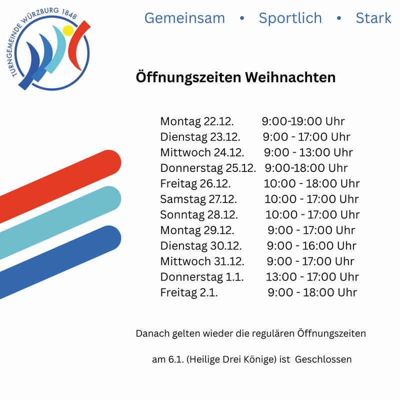 Über die Weihnachtsfeiertage gelten für unseren Kraftraum angepasste Öffnungszeiten.