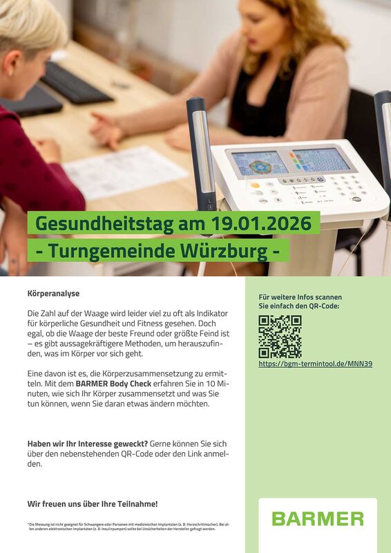 Die Turngemeinde Würzburg von 1848 e.V. veranstaltet gemeinsam mit der BARMER am 19.01. einen Fitnesstag im Foyer der TGW.
