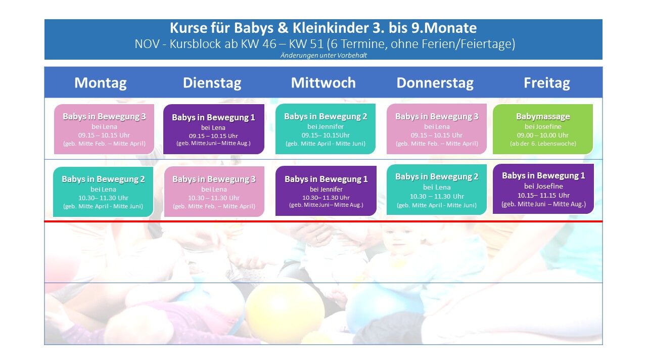 Bei Interesse bitte in unserer "INFOLISTE freie Kursplätze - Babys in Bewegung" (siehe Buchnungssystem Yolawo) eintragen.